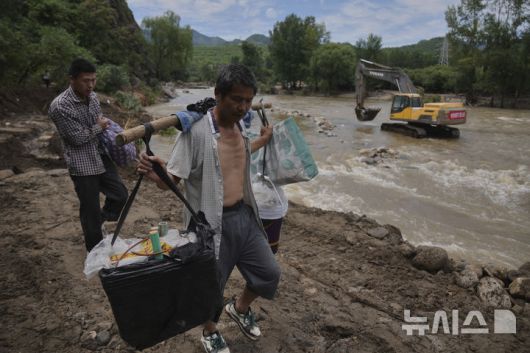 [미원=AP/뉴시스] 29일 중국 베이징 외곽 미원구에 내린 폭우로 홍수가 발생, 주민들이 유실된 도로를 걷고 있다. 2025.07.29. |