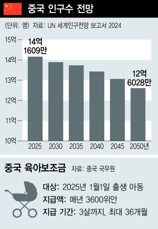 육아수당은 일부 지방정부에서 도입됐지만, 저출생 문제 해결을 위해 중앙정부가 나서 국가 재정을 투입한 첫 사례여서 주목을 받았다. 중국 국무원은 지난 3월 열린 양회에서 한 해 정책 목표를 제시하면서 전국 단위 육아수당 도입을 약속했었다. 그만큼 중국의 저출생에 따른 인구 감소 문제가 심각하다는 걸 보여준다. 파이낸셜타임스는 중국 교육부 통계를 인용해 유치원 등록 아동 수가 2020년 4800만명에서 25%나 줄어 2024년 3600만명을 기록했다고 보도했다. 유엔(UN) 세계인구전망 보고서를 보면, 중국 인구수는 2030년 14억명 밑인 13억8915만명으로 줄어들고, 2050년 12억6028만명까지 감소할 것으로 전망됐다.