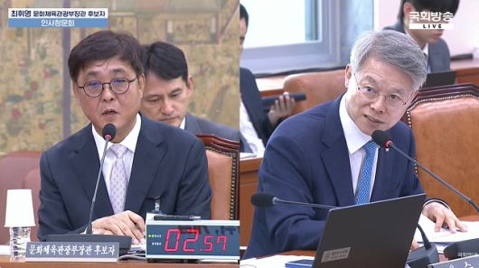 최휘영 문화체육관광부 장관 후보자(왼쪽)가 문화체육관광위원회 인사 청문회에서 민형배 더불어민주당 의원의 질의에 이같이 답하고 있다. /사진=국회방송 캡처 |