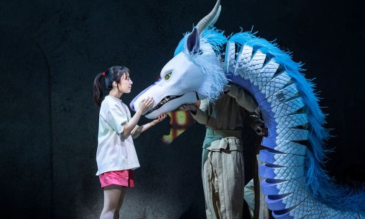 명작 애니메이션을 연극으로 만든 ‘센과 치히로의 행방불명’ 영국 런던 공연에서 주인공 치히로가 하룡(河龍) 하쿠와 대화하고 있다. CJ ENM제공 |