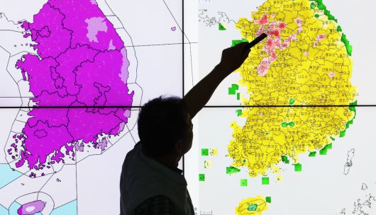 한라산·추자도 제외 무더위 한라산(제주산지)과 추자도 등 2곳을 제외한 전국의 육상 기상특보 구역에 폭염특보가 발령된 29일 경기 수원시 권선구 수도권기상청에서 예보관이 폭염특보 상황을 설명하고 있다. 연합뉴스 |