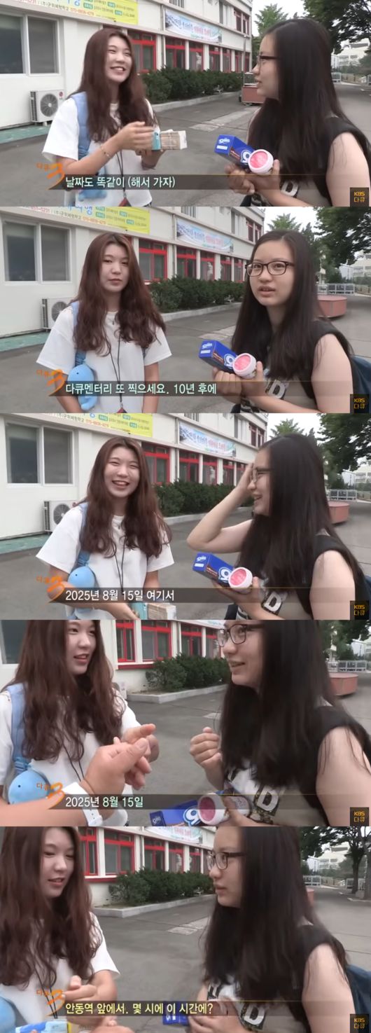 최근 온라인을 뜨겁게 달군 '다큐 3일' 영상은 지난 2015년 여름 방영됐다. 당시 제작진은 내일로 기차 여행을 다니는 전국의 청춘들을 만났다. 그런데 마지막 촬영 쯤 우연히 만난 여대생 두 명과 나눈 짧은 대화가 핵심이다. 여대생들이 “다큐멘터리 꼭 찍으세요, 10년 후에도요”라고 말하자, 감독은 “그때도 이 일을 하고 있을까요?”라며 웃었고, 이들은 “그럼 2025년 8월 15일, 여기서 만나요”라고 즉석에서 약속했다.