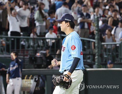 (부산=연합뉴스) 강선배 기자 = 29일 부산 사직야구장에서 열린 프로야구 NC 다이노스와 롯데 자이언츠의 경기. 롯데 김원중이 9회 말 2사 1루 NC 김주원을 삼진으로 잡고 주먹을 불끈 쥐고 있다. 2025.7.29