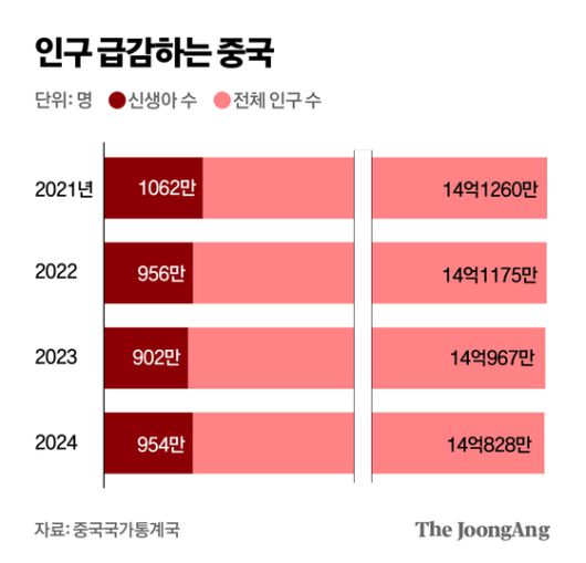 2022년 중국 출생아 수는 956만 명을 기록한 이후 3년 연속 1000만 명을 밑돌고, 전체 인구도 2022년 14억1175만명으로 처음으로 감소세로 돌아서서 3년 연속 줄었다.