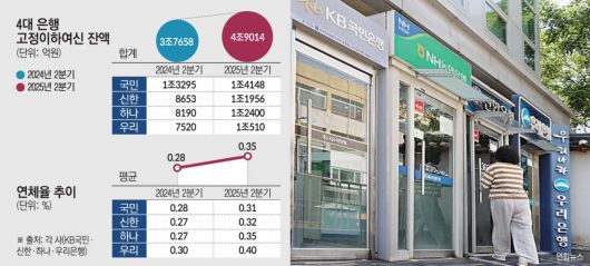 연체율도 모든 은행에서 상승했다. 우리은행은 0.30%에서 0.40%로 0.10%포인트(p) 오르며 4대 은행 중 가장 높은 수준을 기록했다. 이어 하나은행(0.27→0.35%)이 0.08%p, 신한은행(0.27→0.32%) 0.05%p, KB국민은행(0.28→0.31%)이 0.03%p 상승했다.