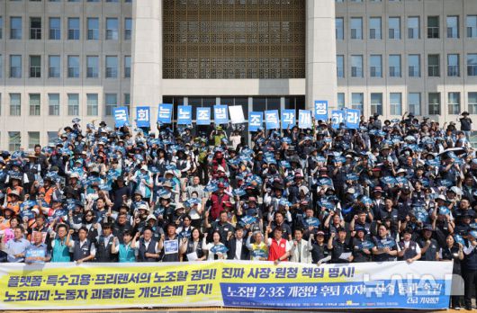 이 밖에도 개정안에서는 '근로자가 아닌 자의 가입을 허용하는 노조는 노조로 보지 않는다'는 요건이 삭제됐다. 이에 특수고용직(특고)·플랫폼 종사자 등 기존 법상 근로자에 포함되지 않는 직업군도 노조 가입 길이 열렸다.