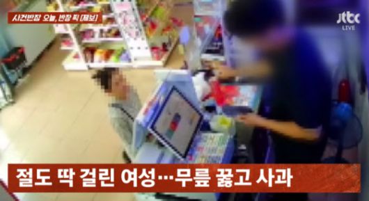 술을 훔치다 걸린 여성이 편의점 바닥에 무릎 꿇고 앉아 용서를 빌고 있다. (사진=JTBC ‘사건반장’ 캡처)