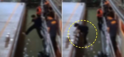 이를 목격한 직원은 여객선 위에서 손을 뻗어 남성을 끌어올리려고 시도한다. 선착장에 있던 다른 관계자들도 밧줄을 들고 달려와 구조에 나섰다.