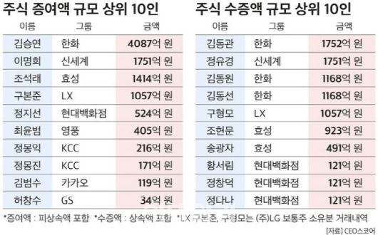 주식 매수 2·3위는 넥슨 총수인 유정현 엔엑스씨 의장의 두 딸인 김정민씨와 김정윤씨가 차지했다. 이어 매수 4·5위에는 조현준 효성 회장과 조현상 HS효성 부회장 형제가 나란히 이름을 올렸다.
