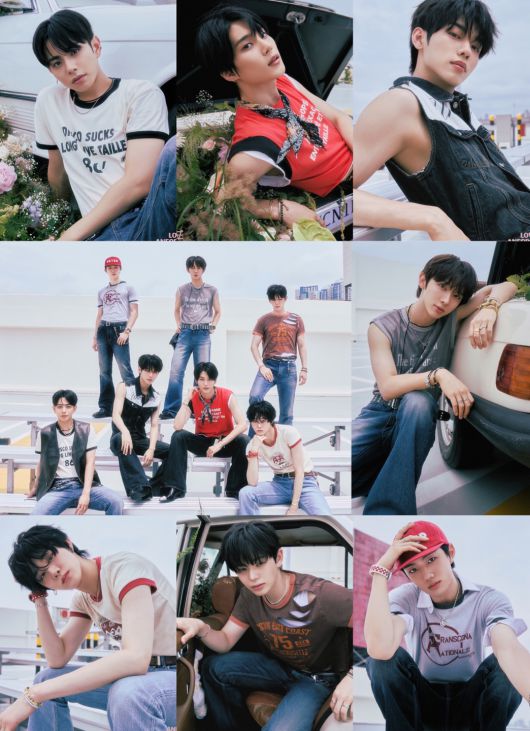 단체 콘셉트 포토에서는 일곱 멤버가 균형감 있게 맞춘 대열로 시각적 안정감과 완전체 시너지가 빛났다. 각자 개성이 드러나는 편안한 소재의 티셔츠에 포인트를 둔 데님 스타일링으로 빈티지한 분위기에 깊어진 눈빛까지 더해 눈부신 비주얼 시너지를 선보였다.