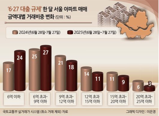 이번 6·27 부동산 대책으로 수도권 주택담보대출 한도가 6억원으로 줄고 소유권 이전 조건부 전세대출 등이 막혀 ‘갭투자(전세 끼고 매매)’가 어려워진 영향으로 해석된다. 실제로 지역별 아파트 거래 비중을 살펴보면 일부 강남권과 ‘한강 벨트’ 비중은 낮아졌지만, 관악구·구로구·도봉구 등 비핵심지 아파트 비중은 증가했다.
