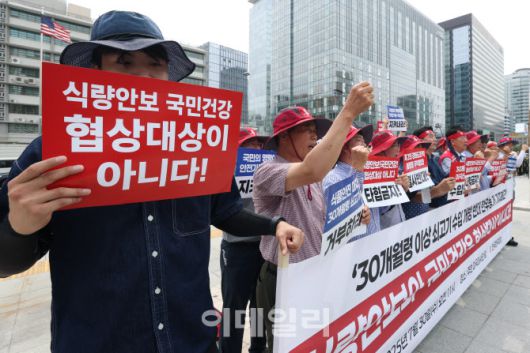 [이데일리 이영훈 기자] 전국한우협회 회원들이 30일 서울 종로구 주한미국대사관 앞에서 '30개월령 이상 미국산 소고기 수입 개방 반대' 기자회견을 열고 구호를 외치고 있다.
