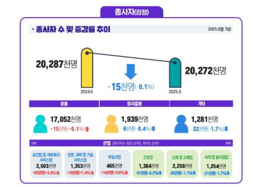 고용노동부가 30일 발표한 2025년 6월 사업체노동력 조사 결과에 따르면, 지난달 기준 종사자 1인 이상 사업체 종사자는 2027만2000명으로 전년 동월 대비 1만5000명 감소했다.
