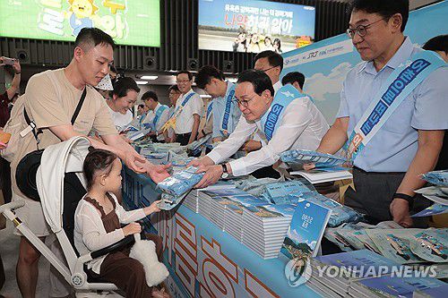(서울=연합뉴스) 류효림 기자 = 노동진 수협중앙회 회장이 30일 서울 강남구 수서역에서 열린 '여름휴가 어촌에서 보내기 캠페인'에서 시민들에게 어촌 여행지 선정 책자와 김, 미역을 배포하고 있다. 2025.7.30