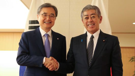 ▲ 조현 외교부 장관(왼쪽)과 이와야 다케시 일본 외무상이 29일 일본 도쿄 외무성에서 한일 외교장관 회담에 앞서 악수하고 있다.