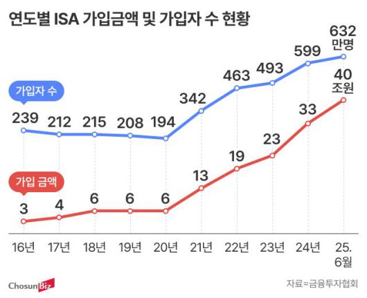 금융투자협회는 30일 지난 6월 말 기준 ISA의 가입금액은 40조3847억원, 가입자 수는 631만 6000명으로 집계됐다고 밝혔다.