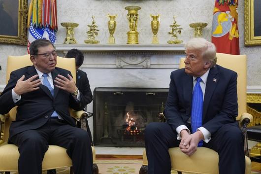 이시바 시게루 일본 총리(왼쪽)와 도널드 트럼프 미국 대통령이 지난 2월 7일(현지 시간) 백악관 집무실에서 회담하고 있다. 뉴시스 |