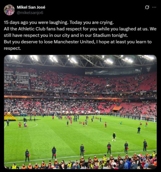 빌바오를 조롱한 대가를 치렀다는 내용이었다. 산 호세는 "15일 전에는 너희가 웃고 있었고, 오늘은 너희가 울고 있다. 모든 빌바오 팬들은 당신들이 우리를 비웃을 때도, 당신들을 존중했다. 오늘도 우리 도시와 경기장 안에서 너희를 존중했다. 그러나 맨유는 패배할 자격이 있다. 적어도 이제는 존중이 무엇인지 배우길 바란다"며 강도 높은 저격을 이어갔다.
