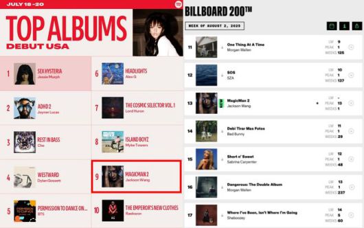 특히 이번 성적은 2022년 발표된 전작 ‘MAGIC MAN’(‘빌보드 200’ 15위)을 뛰어넘으며, 잭슨이 자신의 기록을 다시 쓴 것이다. ‘MAGIC MAN 2’는 발매 첫 주 3만 2천 장 이상의 판매고를 올렸으며, ‘톱 앨범 세일즈’ 4위, ‘바이닐 앨범’ 3위, ‘인디 스토어 앨범 세일즈’ 2위를 기록했다. 또 스포티파이 ‘톱 앨범 데뷔 미국’ 차트에서는 9위에 이름을 올리며 글로벌 시장에서 강력한 존재감을 과시했다.