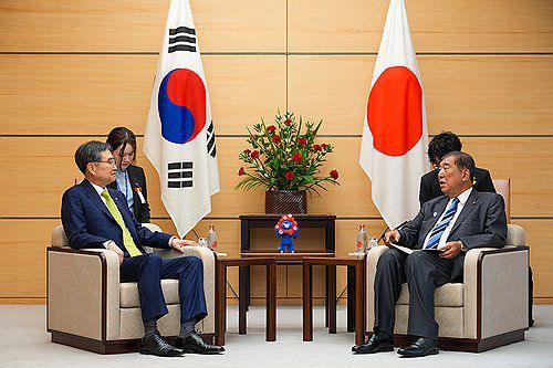 (도쿄=연합뉴스) 30일 도쿄 총리관저에서 조현 외교부 장관(왼쪽)이 이시바 시게루 일본 총리를 예방해 면담하고 있다. 2025.7.30 [외교부 제공. 재판매 및 DB 금지]