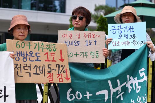 '60+기후행동'은 30일 오전 서울 종로구 국정기획위원회 앞에서 기자회견을 열고 공공기관 103곳 중 적정 실내온도 기준을 준수한 곳은 단 1곳에 불과하다고 발표했다.