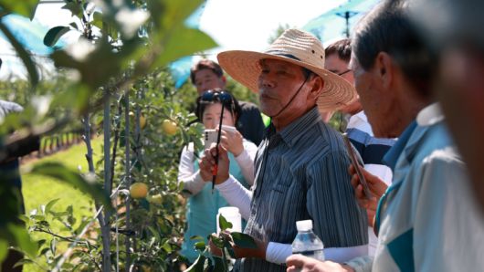 대구 군위군은 ‘골든볼 시범 과원’에서 ‘골든볼 사과’ 시범사업 현장견학을 실시했다고 30일 밝혔다. 이번 견학은 국산 여름사과 신품종인 ‘골든볼’의 성공적인 정착과 확대 보급을 위한 일환으로 마련됐다.