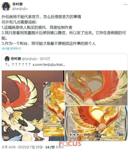 한편, 주식회사 포켓몬은 이번 논란에 대해 공식 홈페이지 입장을 통해 '칠색조 ex'카드가 X의 유저 A가 그린 팬아트를 참고해 그린 것임을 인정하고 수정할 것을 약속했다.