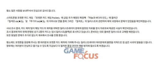 마지막으로 주식회사 포켓몬은 "평소에도 포켓몬을 응원해 주시는 팬 여러분과 포켓몬 카드 제작에 기여해 주시는 일러스트레이터 여러분에게 불편을 끼쳐드린 점 깊은 사과의 말씀을 드린다"라며 "향후에는 여러분이 안심하고 즐기실 수 있도록 지금보다 더 철저한 품질 관리와 재발 방지에 힘쓰도록 하겠다"라고 밝혔다.