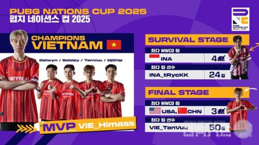 7월 25일부터 27일까지 3일간 펼쳐진 파이널 스테이지 최종 결과, 베트남 대표팀은 누적 포인트 216점으로 우승 트로피를 들어올렸다. 케르베로스 e스포츠(CERBERUS Esports)와 디 익스펜더블스(The Expendables) 등 베트남 프로팀 출신 선수들로 구성된 대표팀은 강력한 전투력과 안정적인 운영을 바탕으로 세계 정상에 올랐으며, '히마스(Himass)' 선수는 총 44킬과 7,935 대미지를 기록하며 MVP에 선정됐다.