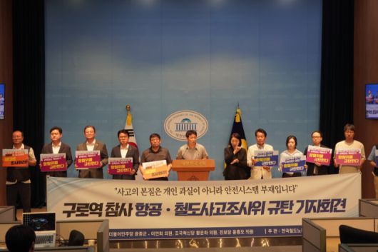 더불어민주당을 비롯한 범여권 의원들이 30일 지난해 서울 구로역에서 두 명의 한국철도공사(코레일) 직원이 사망한 것과 관련해 “사고 원인의 본질은 개인 과실이 아니라 안전시스템 부재”라며 항공철도사고조사위원회(항철위)를 규탄했다.