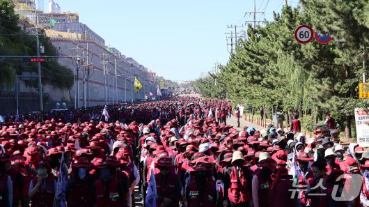 (울산=뉴스1) 조민주 기자 = 올해 임금 및 단체협상 교섭에서 난항을 겪고 있는 민주노총 전국플랜트건설노조 울산지부가 연일 부분 파업을 벌이고 있다.