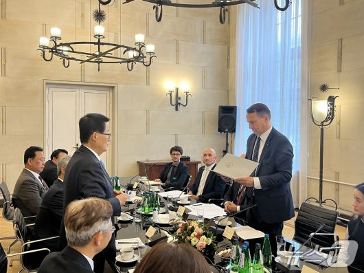 박지원 의원을 단장으로 하는 대통령 특사단은 29일 라도스와프 시코르스키 폴란드 부총리 겸 외교장관과의 면담에서 이재명 대통령의 메시지를 담은 도날드 투스크 총리 앞 친서를 전달했다. 2025.07.30. (외교부 제공) |