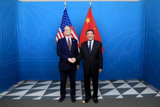 28일(현지시간) 스콧 베선트 미국 재무장관과 허리펑 중국 국무원 부총리가 스웨덴 스톡홀름에서 3차 미중 고위급 무역협상을 갖기 전 기념 촬영을 하고 있다. /AFPBBNews=뉴스1 |