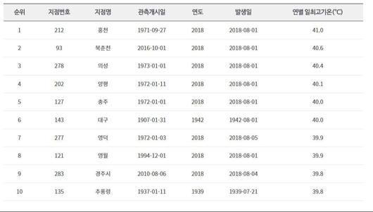 서울의 최고기온 역시 같은 날 기록한 39.6도이고, 7월 중 최고기온은 1994년 7월24일의 38.4도다. 올해엔 경기 안성의 기온이 지난 27일 자동기상관측장비(AWS)로 40.6도까지 치솟은 바 있다.