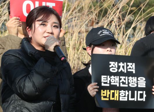김소연 변호사 등이 3월 11일 대전 유성구 한국과학기술원(KAIST) 정문 앞에서 기자회견을 열고 윤석열 대통령 탄핵 반대 비상시국선언을 하고 있다. 뉴스1 |
