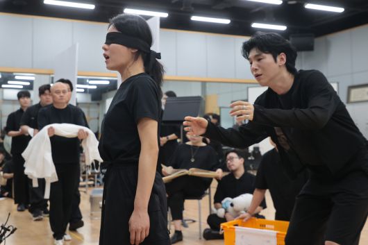 심청 역을 맡은 김율희 배우(왼쪽)와 심봉사를 맡은 김준수 배우가 30일 서울 중구 국립극장 뜰아래연습장에서 국립창극단 신작 <심청>의 장면을 시연하고 있다. 연합뉴스