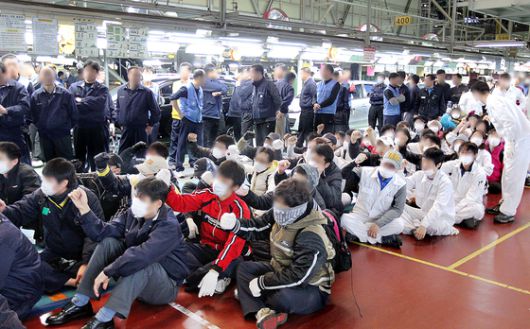 2010년 11월 17일 현대자동차 비정규직 근로자들이 울산 3공장을 점거한 채 파업 농성을 벌이고 있다. 주변에 관리직 직원들이 생산라인을 지키고 있다. 연합뉴스 |