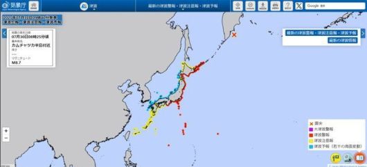 아시아투데이 한대의 기자 = 러시아의 캄차카 반도 부근에서 30일 오전 8시 25분 경 지진이 발생했다. 이로 인해 일본 전역이 쓰나미 영향권에 노출됐으며, 최고 3m 이상의 쓰나미가 들이닥칠 것으로 보인다.