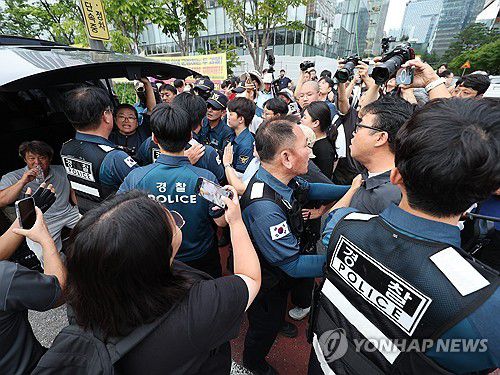 (서울=연합뉴스) 서명곤 기자 = 한미 관세 협상 시한을 이틀 앞둔 30일 서울 광화문 KT 광화문빌딩 앞에서 트럼프위협저지공동행동이 연 트럼프 위협저지 주권실현 시민대회에서 참가자들이 집회용품 설치를 두고 경찰과 대치하고 있다. 2025.7.30