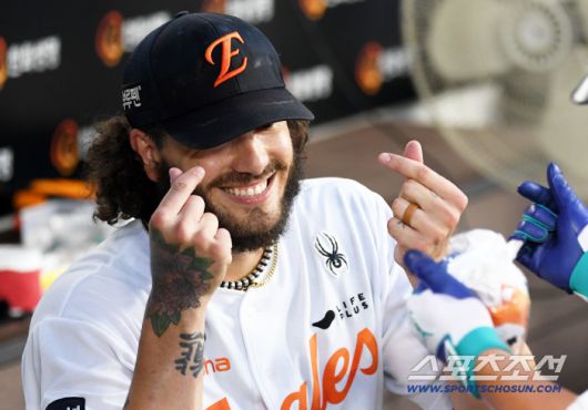 30일 대전 한화생명볼파크에서 열린 한화 이글스와 삼성 라이온즈의 경기. 3회말 2사 한화 노시환이 솔로포를 터뜨리자 폰세가 하트를 보내고 있다. 대전=박재만 기자 pjm@sportschosun.com/2025.07.30/기 |