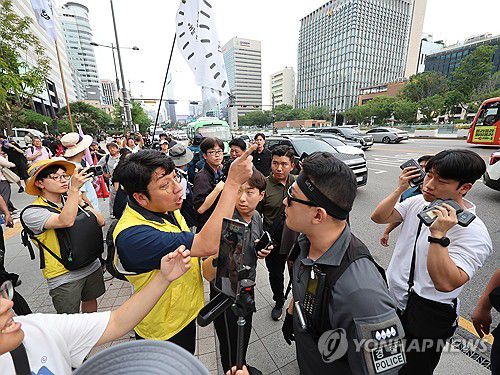(서울=연합뉴스) 서명곤 기자 = 한미 관세 협상 시한을 이틀 앞둔 30일 서울 광화문 KT 광화문빌딩 앞에서 트럼프위협저지공동행동이 연 트럼프 위협저지 주권실현 시민대회에서 경찰이 바리케이트를 설치하려하자 참가자들이 이에 항의하고 있다. 2025.7.30