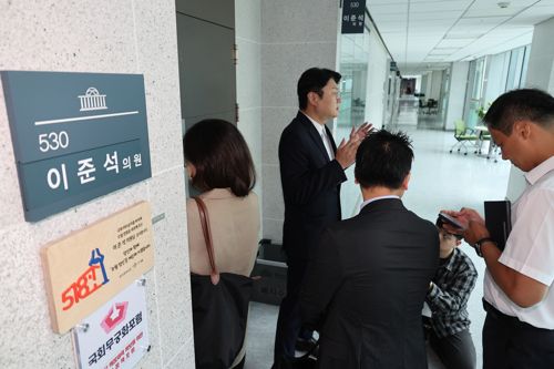 개혁신당 김정철 최고위원이 30일 서울 여의도 국회 의원회관 이준석 의원실 앞에서 '김건희특검 관련 압수수색 절차적 문제점 및 준항고 주요 이유 언론 브리핑'을 하고 있는 가운데 특검 관계자들이 압수수색을 위해 의원실로 들어가고 있다. 2025.7.30[연합뉴스 제공] |
