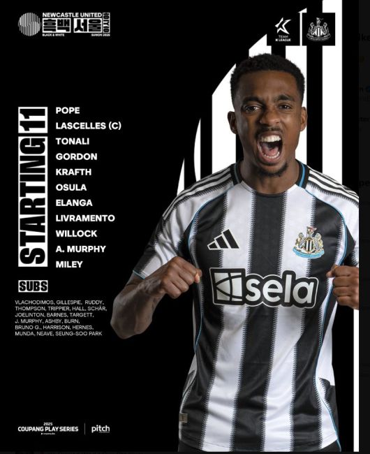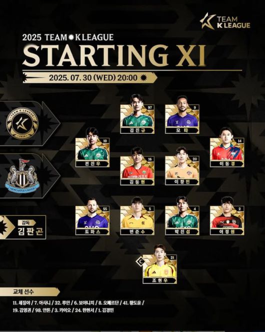 뉴캐슬과 팀 K리그는 30일 오후 8시 수원월드컵경기장에서 열리는 2025 쿠팡플레이 시리즈 첫 번째 경기를 앞두고 선발 명단을 공개했다.