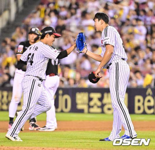 [OSEN=잠실, 박준형 기자] 30일 오후 서울 잠실구장에서 ‘2025 신한 SOL BANK KBO리그’ LG 트윈스와 KT 위즈의 경기가 진행됐다. 이날 LG는 손주영(8승 6패)을 KT는 패트릭(0승 0패)을 선발투수로 내세웠다. 6회초 이닝종료 후 LG 손주영이 호수비 펼친 박관우와 하이파이브를 하고 있다. 2025.07.30 / soul1014@osen.co.kr