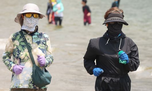 시민들이 햇빛을 차단하는 복장을 하고 걷기를 하고 있다. 연합뉴스 |