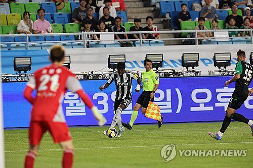 (수원=연합뉴스) 홍기원 기자 = 30일 수원월드컵경기장에서 열린 2025 쿠팡플레이 시리즈 팀 K리그와 뉴캐슬 유나이티드의 경기. 뉴캐슬 안토니 엘랑가가 드리블 하고 있다. 2025.7.30