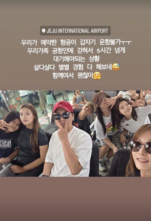 앞서 부부와 5남매는 제주도로 가족여행을 떠난 모습을 공개하며 훈훈함을 자아냈다. 뜨거운 날씨에도 화목한 이들의 모습이 눈길을 끈 가운데, 갑작스러운 운항 불가에 공항에 발이 묶인 상황에도 웃음을 잃지 않고 있다.