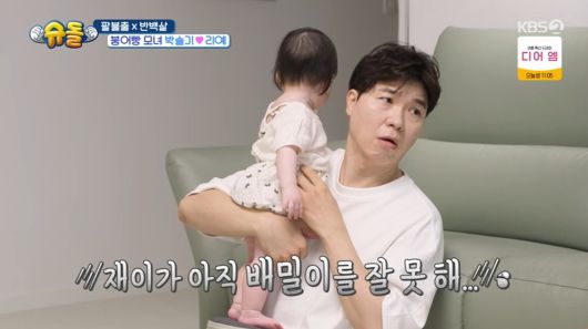박수홍은 박슬기에게 "우리 애 배밀이가 느리다"며 고민을 털어놨다. 이에 박슬기는 "리예는 배밀이 없이 기었고 걷는 거 없이 뛰었다"고 말하며 걱정을 덜어줬다. 이어 "리예도 배밀이가 조금 늦어서 앞에 간식을 두고 연습했다"고 조언했다.