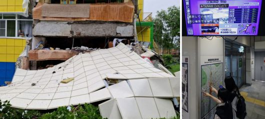 러 ‘유치원 건물’ 폭삭…일 “쓰나미 올라” 조마 30일 발생한 강진으로 러시아 캄차카반도 동남쪽 페트로파블롭스크캄차츠키의 한 유치원 건물이 무너졌다(왼쪽 사진). 이날 일본 도쿄의 한 기차역 TV 화면에 지진에 따른 쓰나미 경보와 대피령이 내려진 지역이 표시돼 있다. 로이터·EPA연합뉴스 |