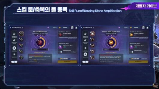 초월 등급 스킬 룬과 축복의 돌에 증폭을 적용할 수 있다. 동일 스킬 룬, 축복의 돌이 재료지만 실패 시 소모되지 않고, 성공 시에만 소모되는 방식이다. 증폭 재료는 시간의 전장, 파멸의 권좌, 이벤트 등을 통해 획득할 수 있다.